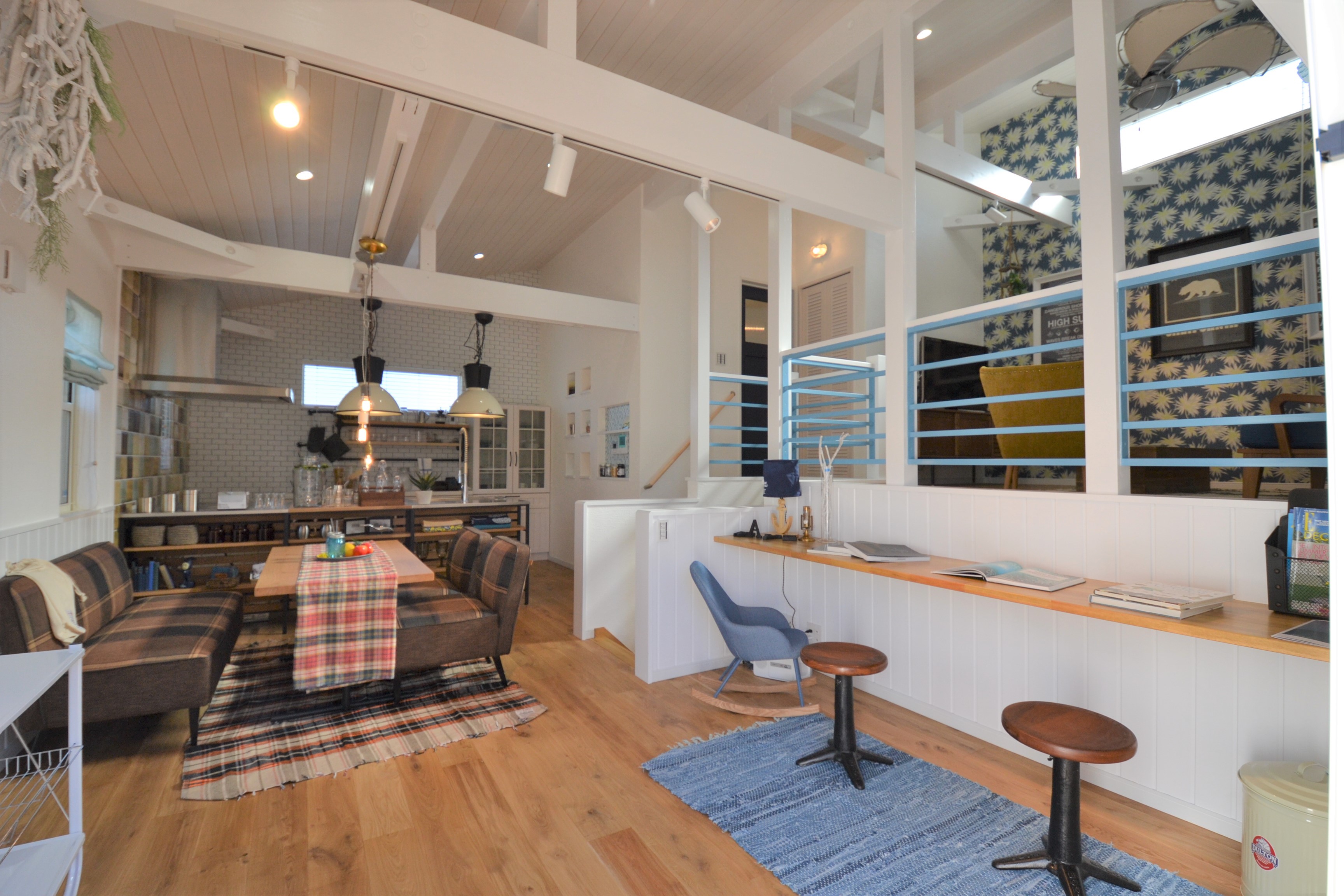 吹き抜け・勾配天井:天井を高くすることで、視覚的な開放感を演出。