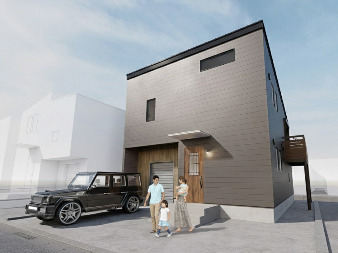片流れの屋根に、アウトドアライフを満喫できるミニガレージ付き。