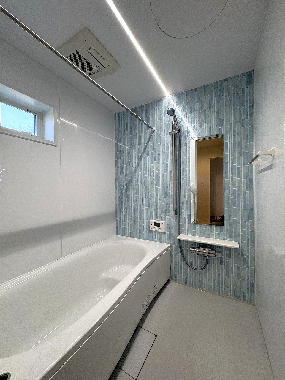 やわらかな光とブルータイルが心地いいバスルーム。1日の終わりに、ほっとひと息つける癒しの時間を。