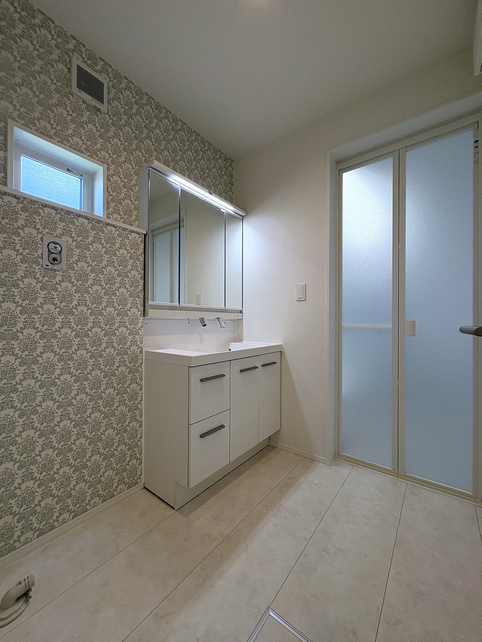 やわらかな光と柄クロスが映える洗面室。朝の支度も、ちょっと気分が上がる空間に
